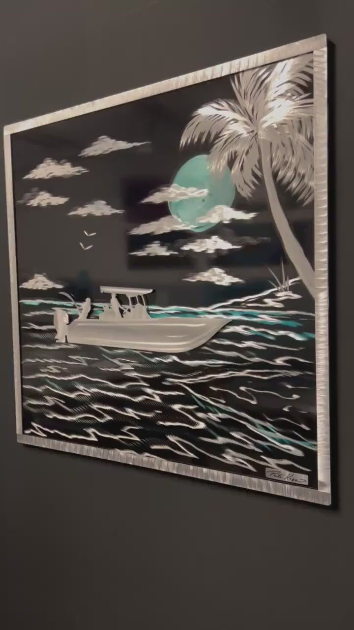 Check out this Night Fishing Scene by Pete Koza Metal Art Made out of high grade aluminum with a dynamic mounting bracket assembled on the back, your piece of art is ready to hang. This art is clear coated and can hang indoor or outdoor but must avoid constant and direct sunlight. It is very durable and will be unaffected by moisture.