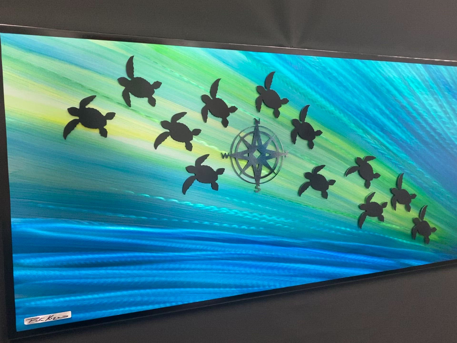 Check out this Sea life turtle design by Pete Koza Metal Art is designed to hang horizontal. Made out of high grade aluminum with a dynamic mounting bracket assembled on the back, your piece of art is ready to hang. This art is clear coated and can hang indoor or outdoor but must avoid constant and direct sunlight. It is very durable and will be unaffected by moisture.