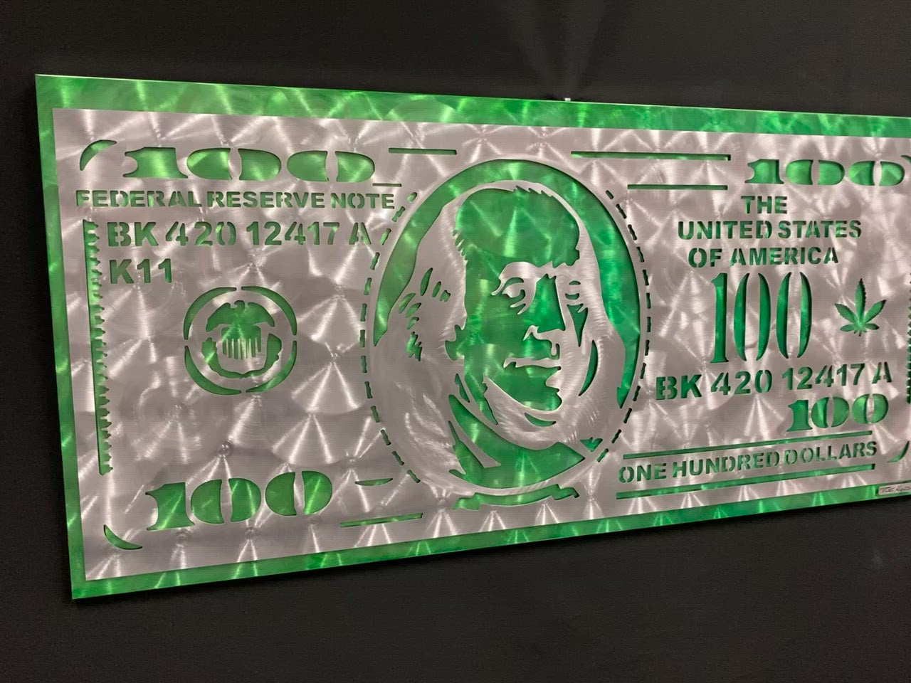 Check out this $100 Bill Pot Leaf Edition Metal Art by Pete Koza! All of my art is clear-coated for durability and comes with a bracket on the back for easy hanging. Metal art can be hung outside and holds up great in the elements but keep in mind that if the metal art piece does get hit with direct sunlight that it will fade over time.