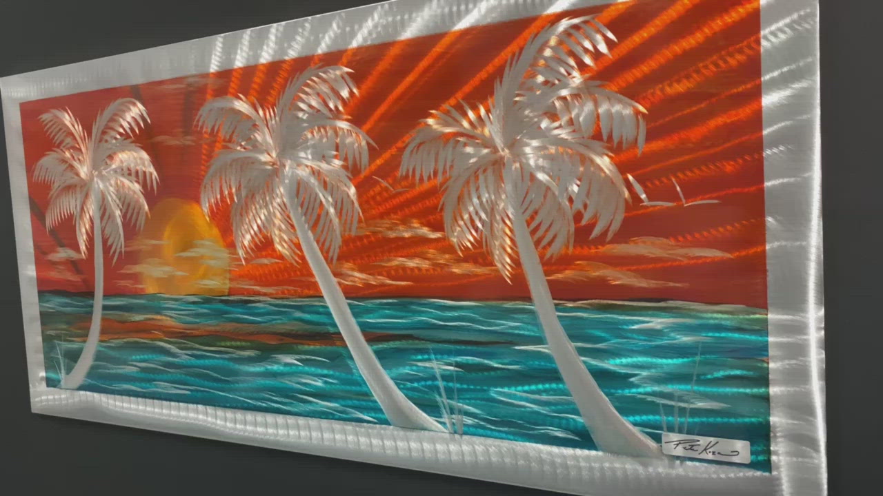 Check out this amazing Orange palm scene, This is designed to hang horizontal. Made out of high grade aluminum with a mounting bracket assembled on the back, your piece of art is ready to hang. This art is clear coated and can hang indoor or outdoor but must avoid constant and direct sunlight. It is very durable and will be unaffected by moisture.