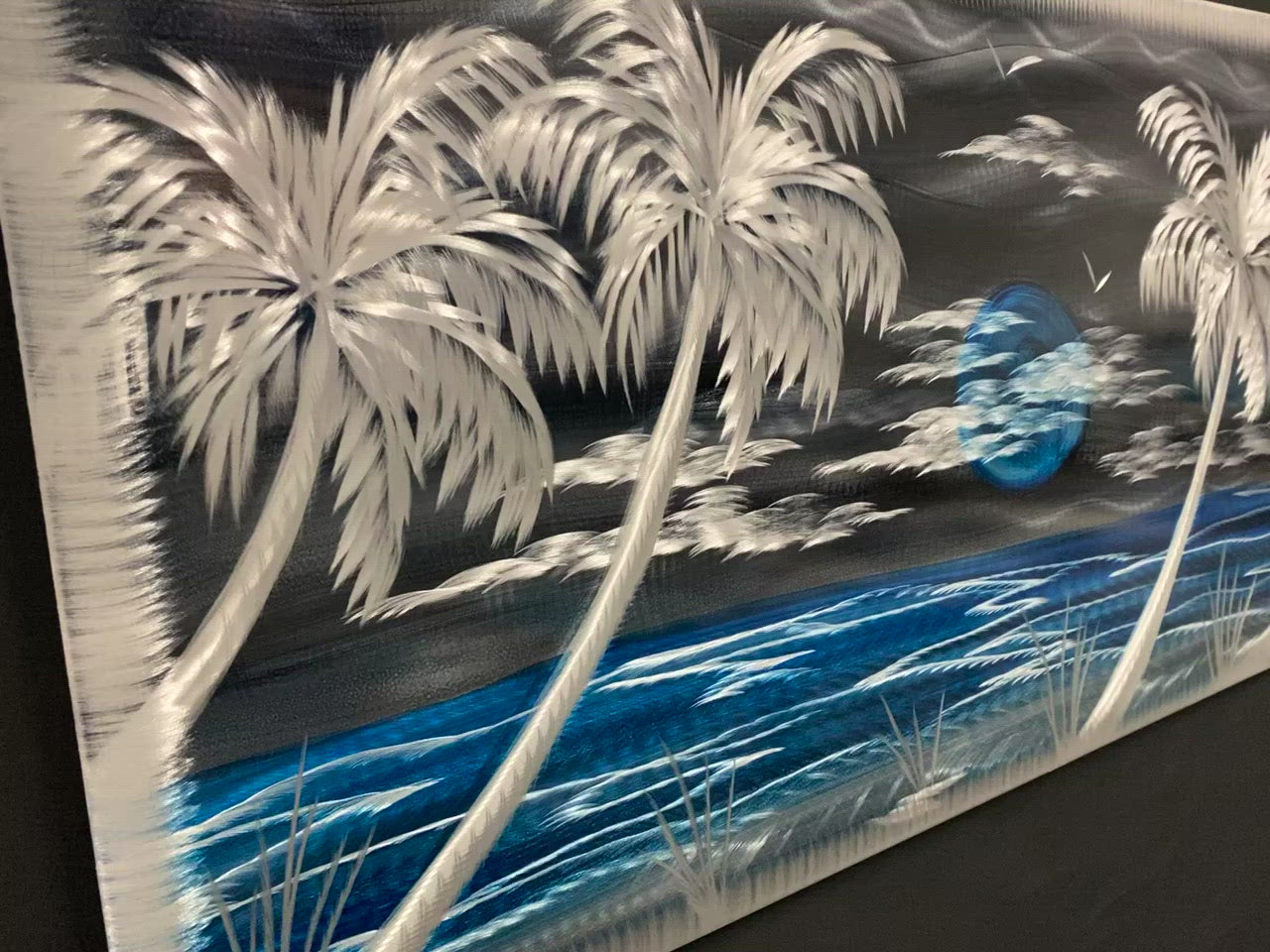 Check out this Blue Moon Silver Palms Delight by Pete Koza it's designed to hang horizontally. Made out of high grade aluminum with a dynamic mounting bracket assembled on the back, your piece of art is ready to hang. This art is clear coated and can hang indoor or outdoor but must avoid constant and direct sunlight. It is very durable and will be unaffected by moisture.