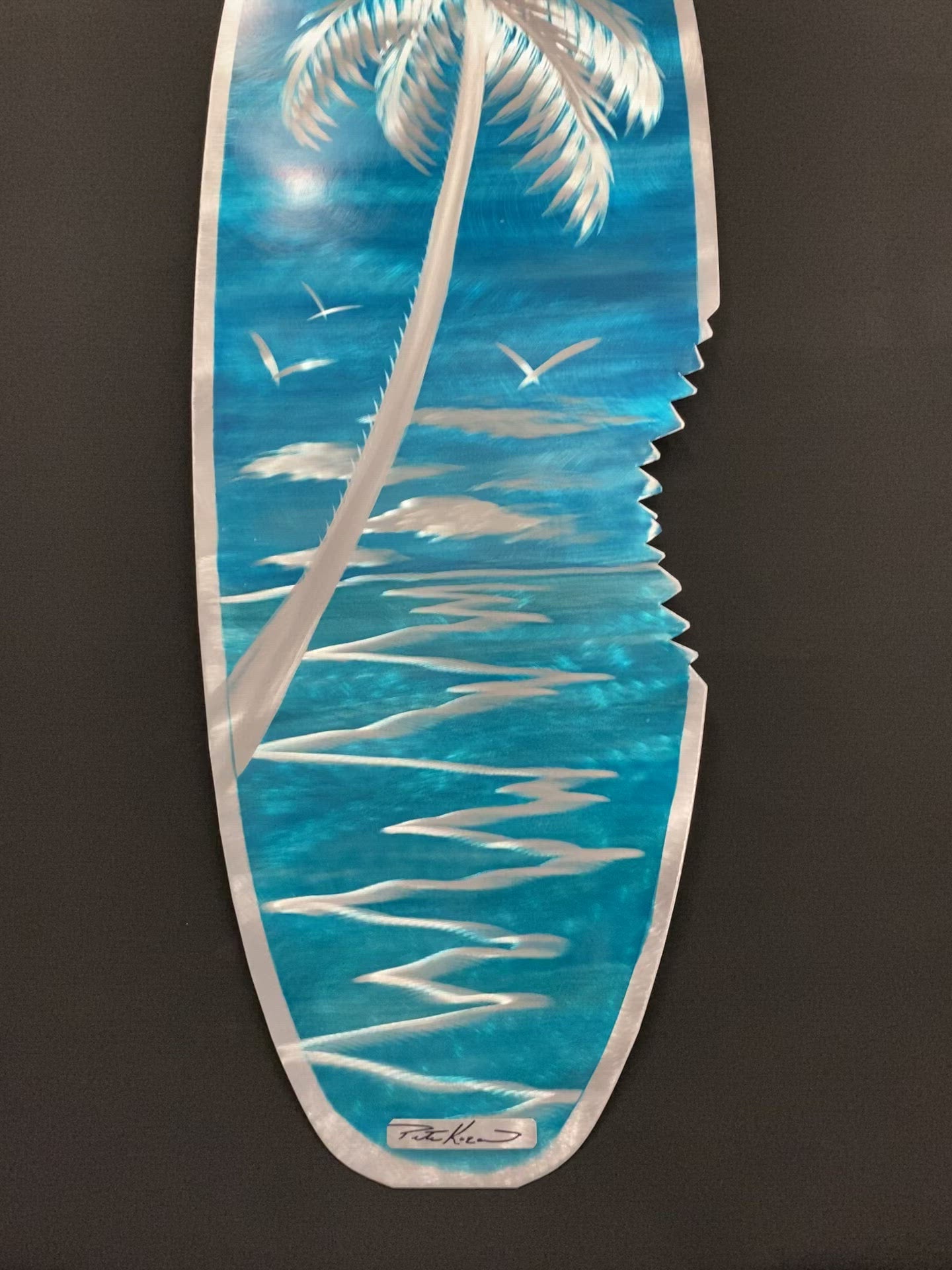 Very popular style! Show your love of surfing with our Sharkbite Surfboard Metal Art by Pete Koza! This is designed to hang vertically All of my metal art is handmade, hand-painted, and crafted with care out of high-grade aluminum. All of my art is clear-coated for durability and comes with a bracket on the back for easy hanging. Metal art can be hung outside and holds up great in the elements but keep in mind that if the metal art piece does get hit with direct sunlight that it will fade over time.